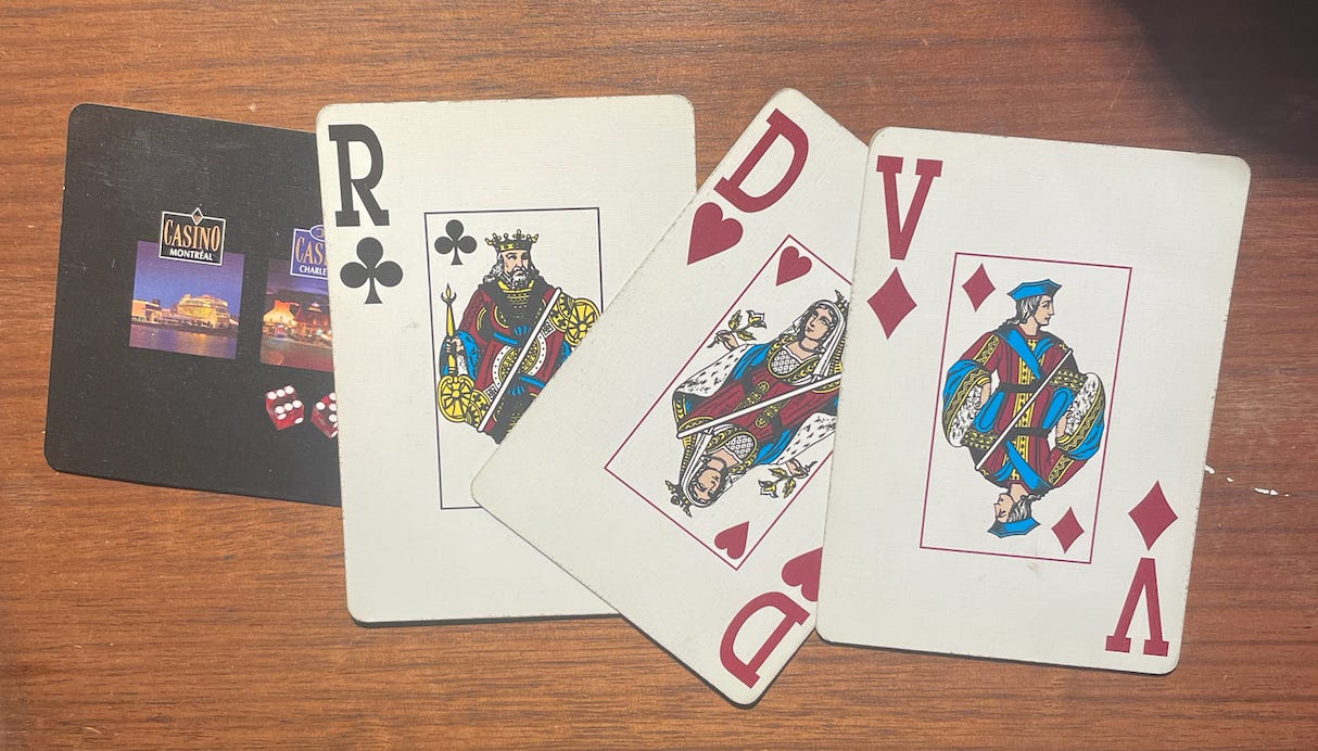 Roi, dame, valet: The Casino de Montréal uses French-language decks for its table games. This builds off the above point: French is the official language of Quebec. The Casino de Montréal, as a government-run entity, procures these decks as a result, but in privately-owned casinos (and every private game in the province, I imagine), the king/queen/jack live on. I need to ask my French friends if they actually use these in France, but I have a feeling that Loto-Québec owns 95% of the world’s French-language decks, because I’ve never seen one for sale.